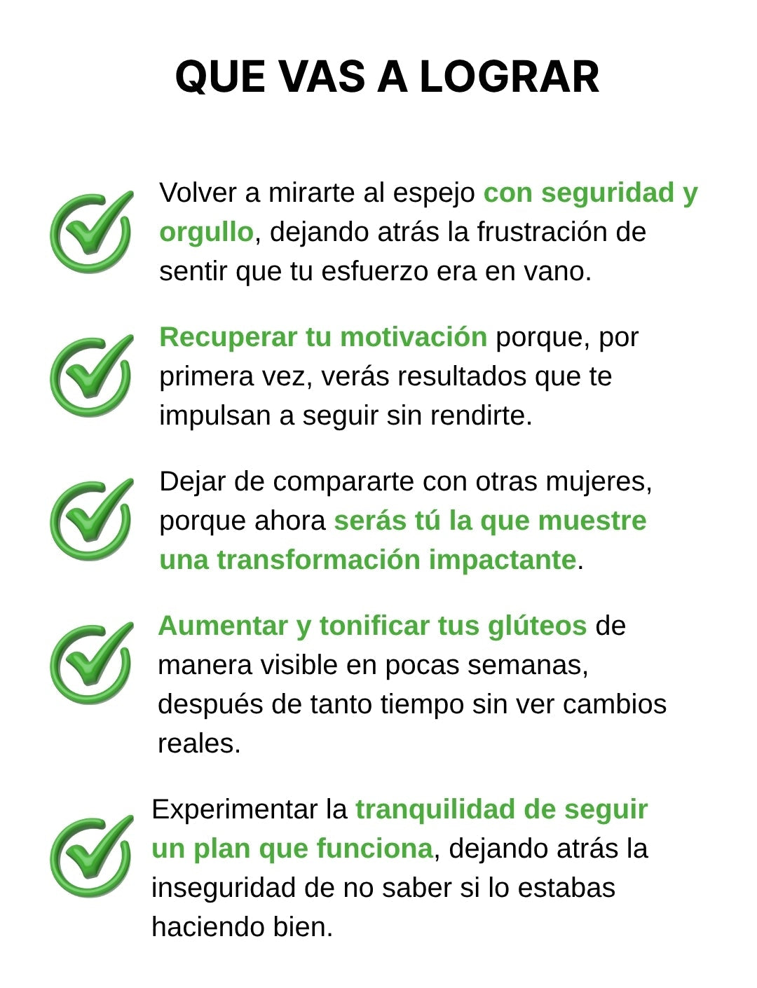 🔹 Semana 5-6: Cambios VISIBLES en glúteos, piernas y abdomen. Tu postura mejorará notablemente